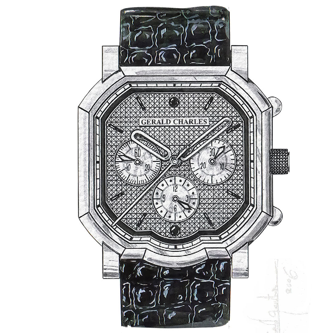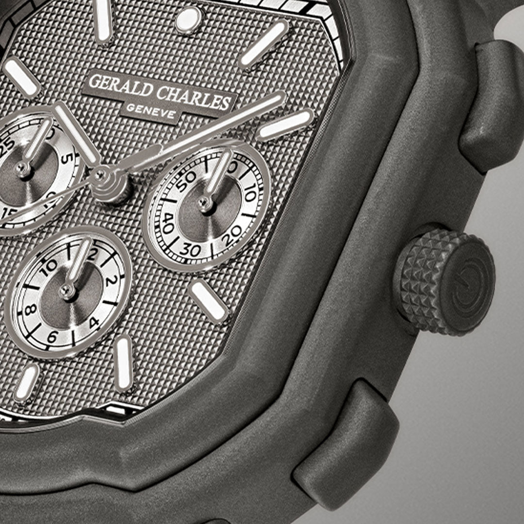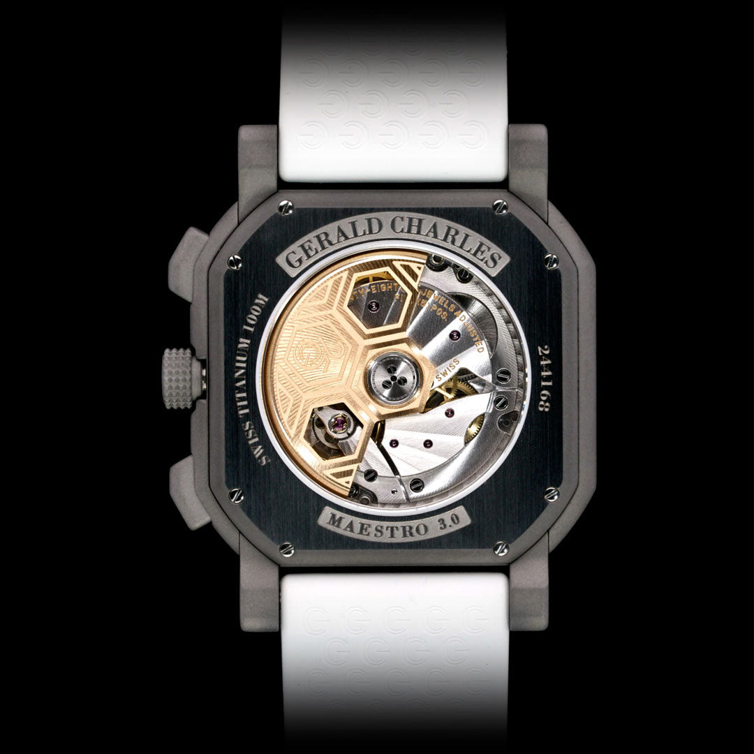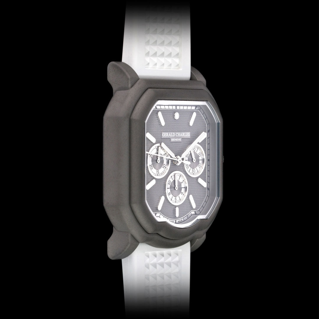 The strap is presented in white vulcanised rubber, featuring a Clous de Paris finish on the top side and the signature Gerald Charles logo tapisserie on the rear, secured with a Darkblast® Grade 5 Titanium pin buckle engraved with the GC logo.
