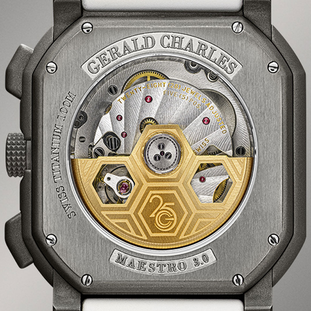 Oscillating weight: Golden central oscillating weight decorated with the new 25th Anniversary logo. Two layers of finishings: sandblasted base, colimaçon and soleil brushed top with the Gerald Charles “honeycomb” motif