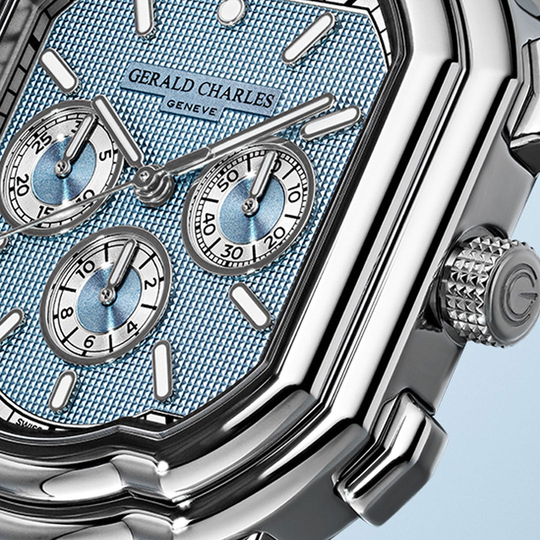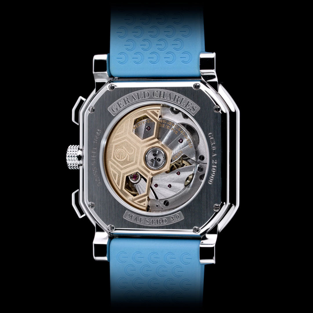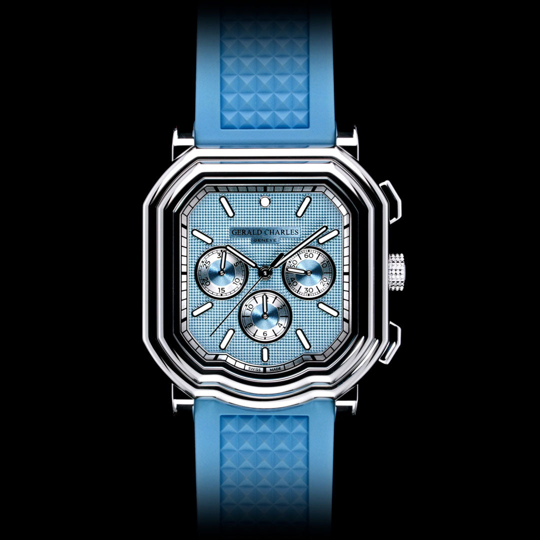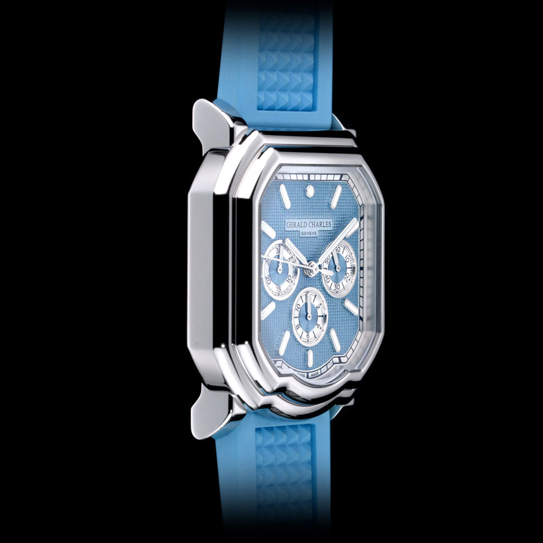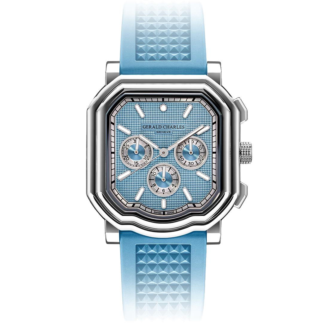 The strap is presented in ice blue vulcanised rubber, featuring a Clous de Paris finish on the top side and the signature Gerald Charles logo tapisserie on the rear, secured with a polished stainless-steel pin buckle engraved with the GC logo.