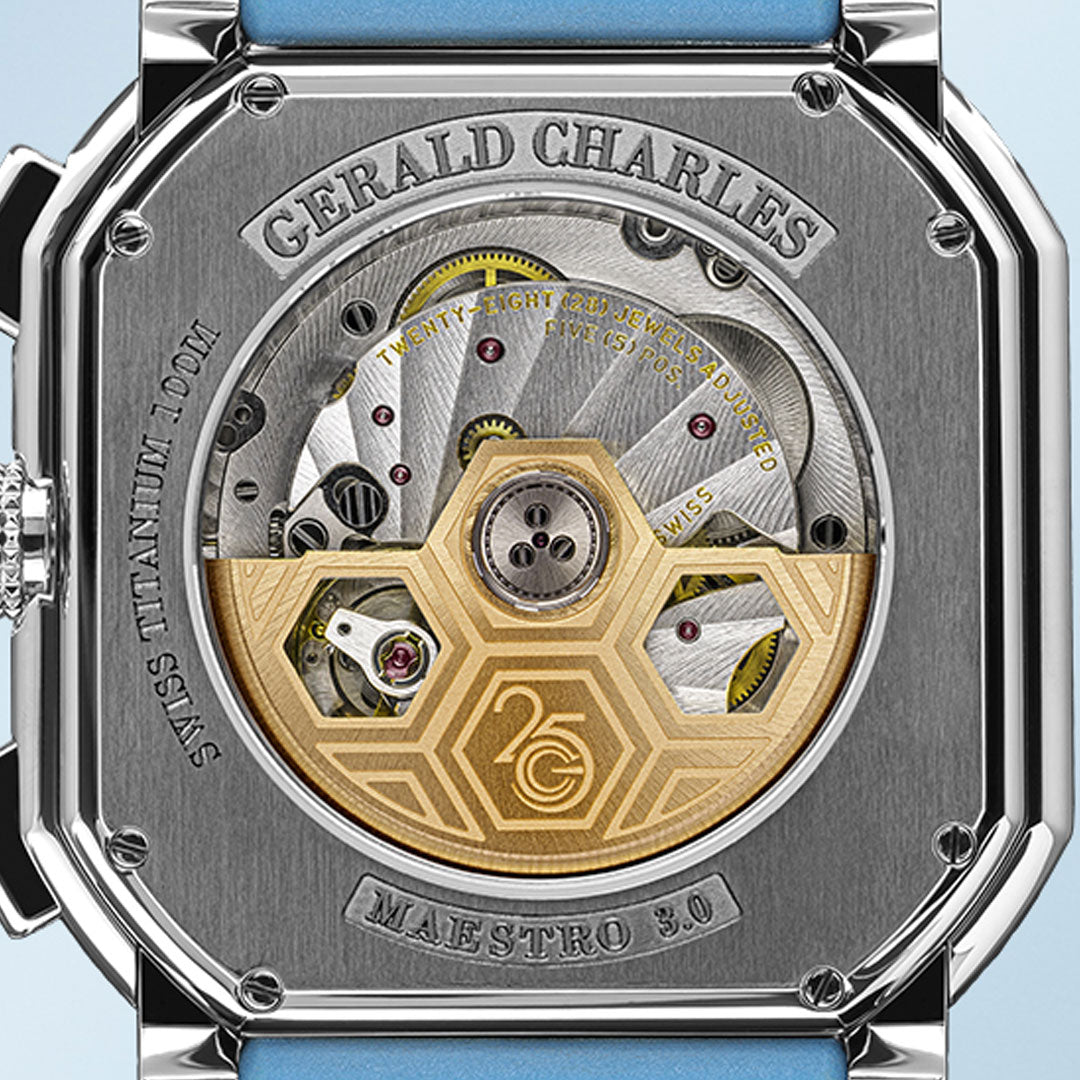 Oscillating weight: Golden central oscillating weight decorated with the new 25th Anniversary logo. Two layers of finishings: sandblasted base, colimaçon and soleil brushed top with the Gerald Charles “honeycomb” motif