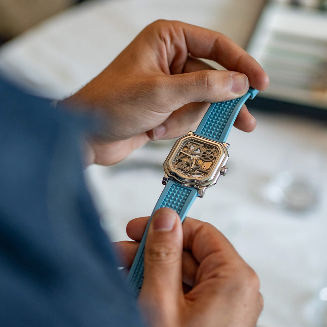 - Strap: ice blue vulcanised rubber to Mr Gerald Genta Clous de Paris design
