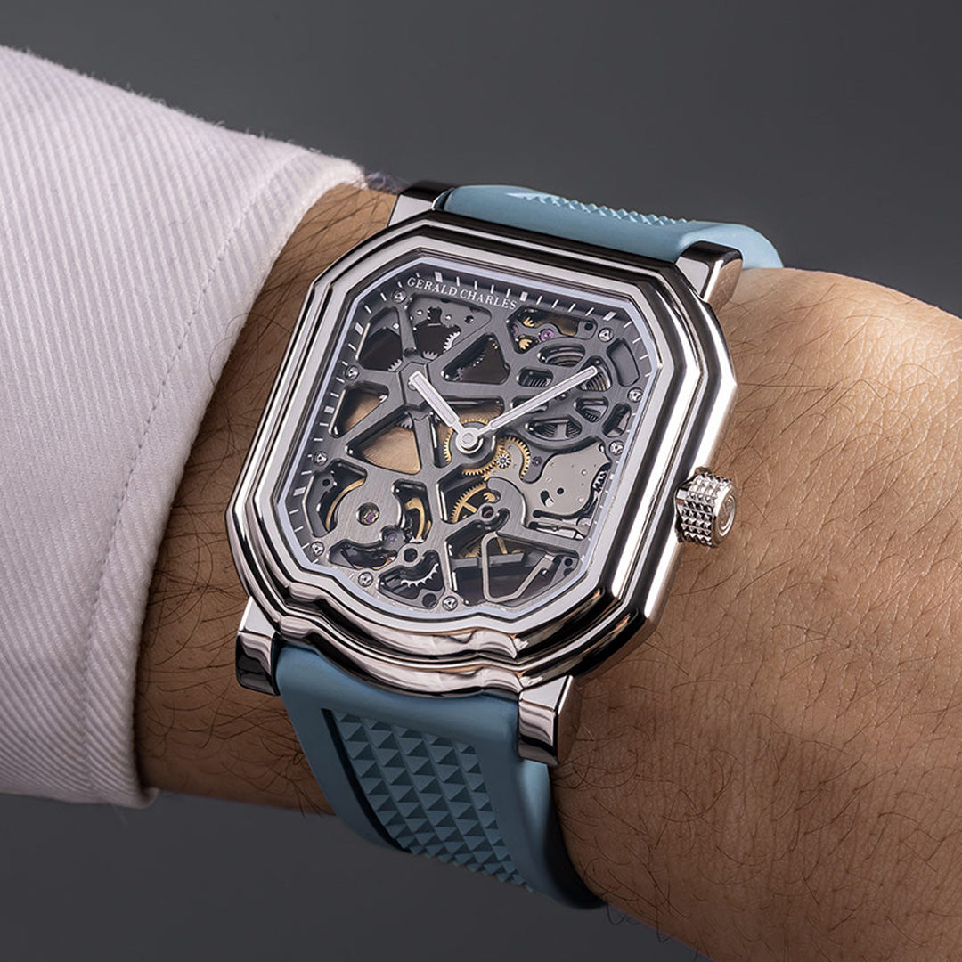 While it comprises 160 components, the movement remains ultra-thin at just 2.6mm high and incorporates an exquisite, star-shaped gold micro rotor running on ceramic bearings in order to allow as much of the mechanism as possible to be on display. And, despite its slimness, the Maestro 8.0 Squelette offers a power reserve of an impressive 50 hours. On the dial side, the skeletonised bridges are satin-finished and rhodium plated or anthracite NAC treated, while all angles, bevels and apertures are hand-polished and all wheels circular-grained on each surface. The rehaut (the inner ring between the dial and crystal) is retained by a series of nine, star-shaped screws that were designed and developed specifically for Gerald Charles. The distinctive Maestro case in which the movement is showcased is equally complex, comprising no fewer than 18 separate components and a screw-down crown that, as with every Gerald Charles watch, ensures the Maestro 8.0 Squelette is water resistant down to an impressive 100 metres - a feature complemented by the clous de Paris patterned rubber strap.