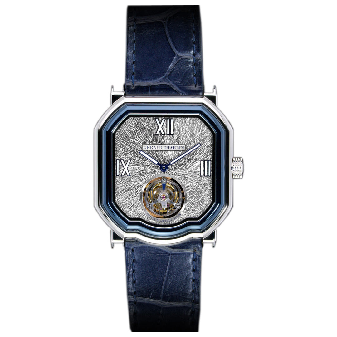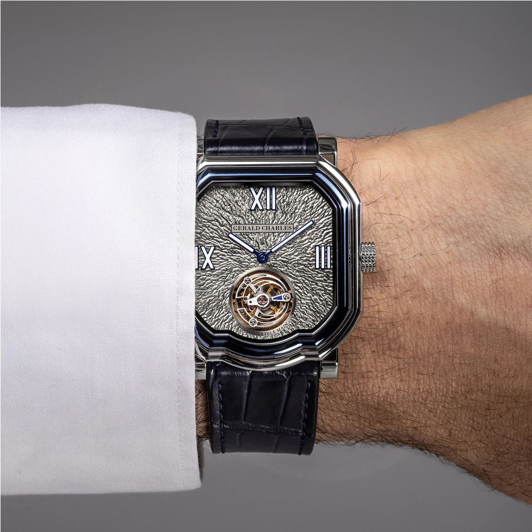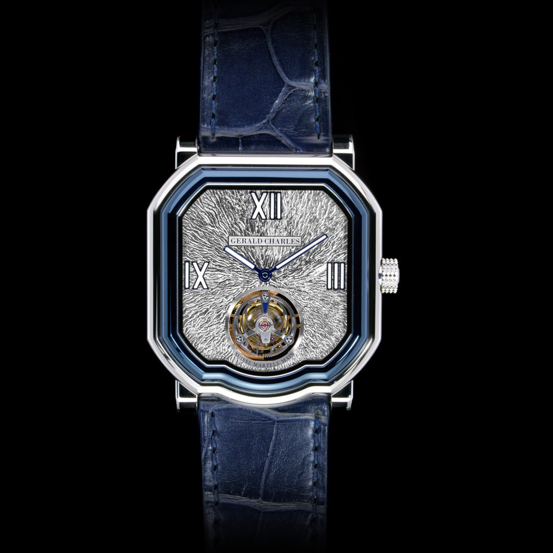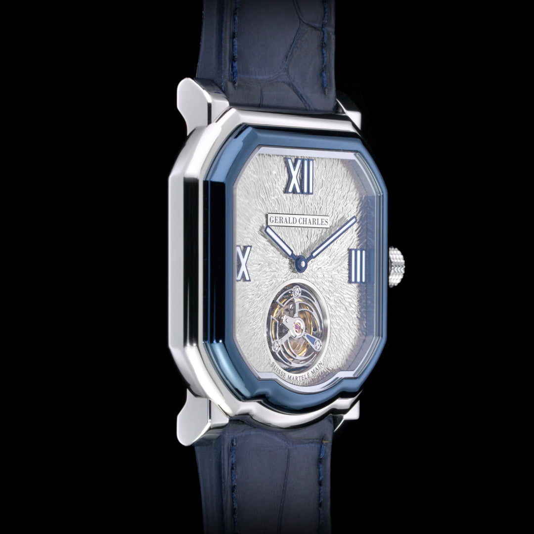 The exclusive manufacture movement features bespoke bridge designs decorated with a special vertical Côtes de Genève pattern inspired by tailoring, thanks to Mr. Genta’s Italian heritage. Anglages diamond polished. Radial côtes de Genève finished bridge of the tourbillon. Yellow gold colour engravings. Gerald Charles’ team succeeded in realizing a highly sophisticated 60-seconds flying tourbillon that oscillates at 4 Hz and in delivering a highly technical mechanical watch that remains incredibly slim, measuring just 9mm thick.