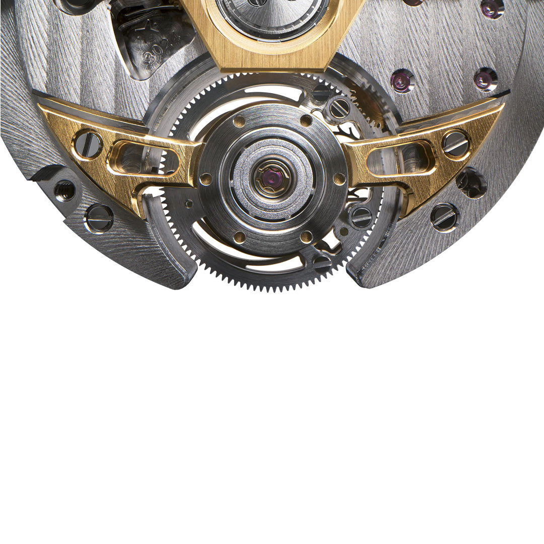 Tourbillon Bridge: 18K yellow gold bridge which secures the tourbillon to the movement