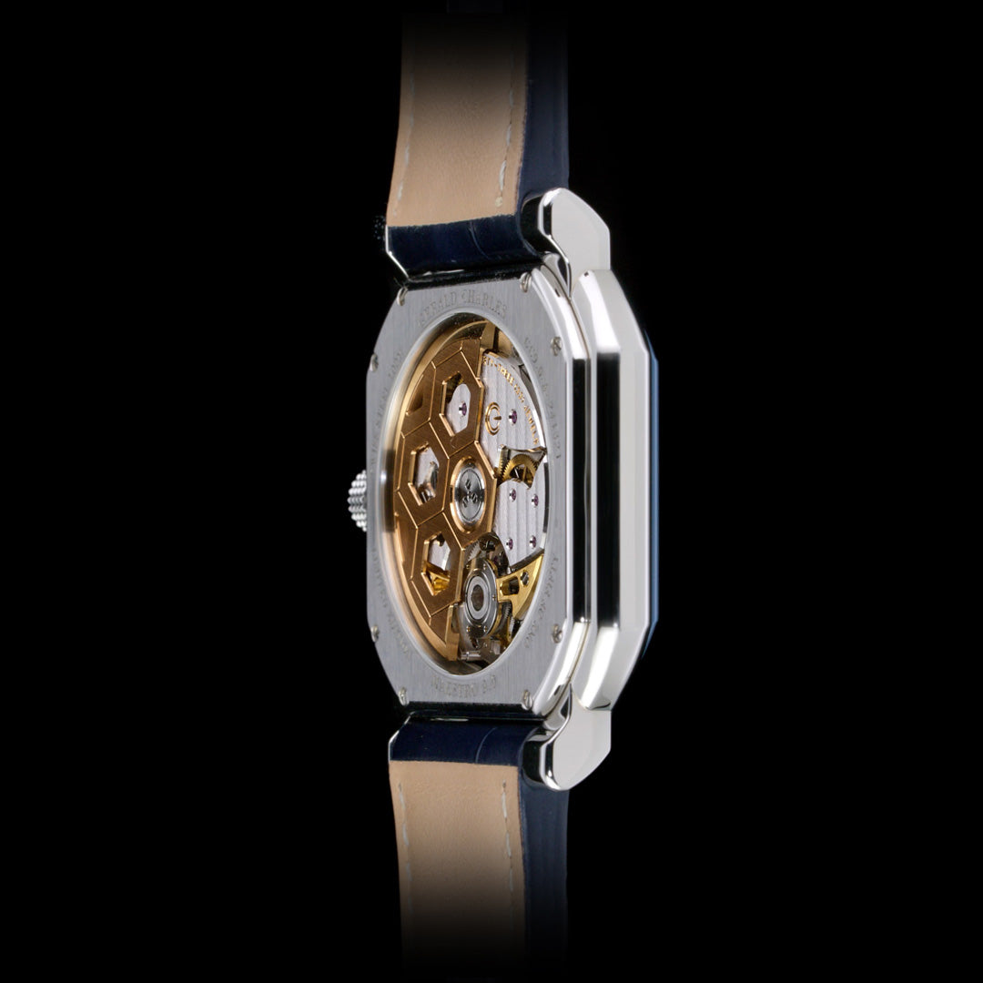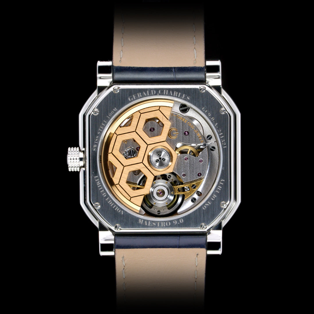 Oscillating Weight: Central oscillating weight in 22K rose gold 4N, vertical brushed Gerald Charles “honeycomb” motif with polished outlines