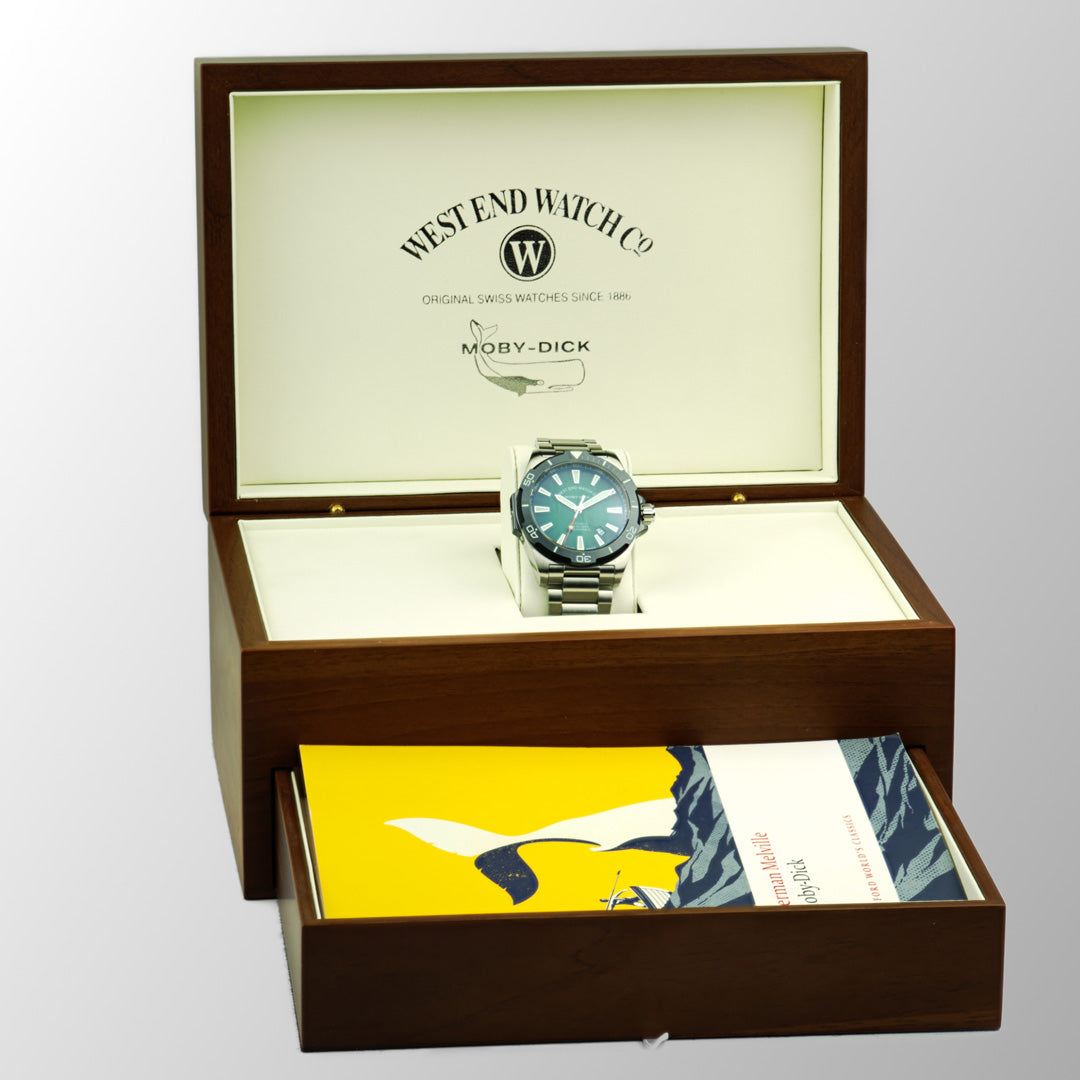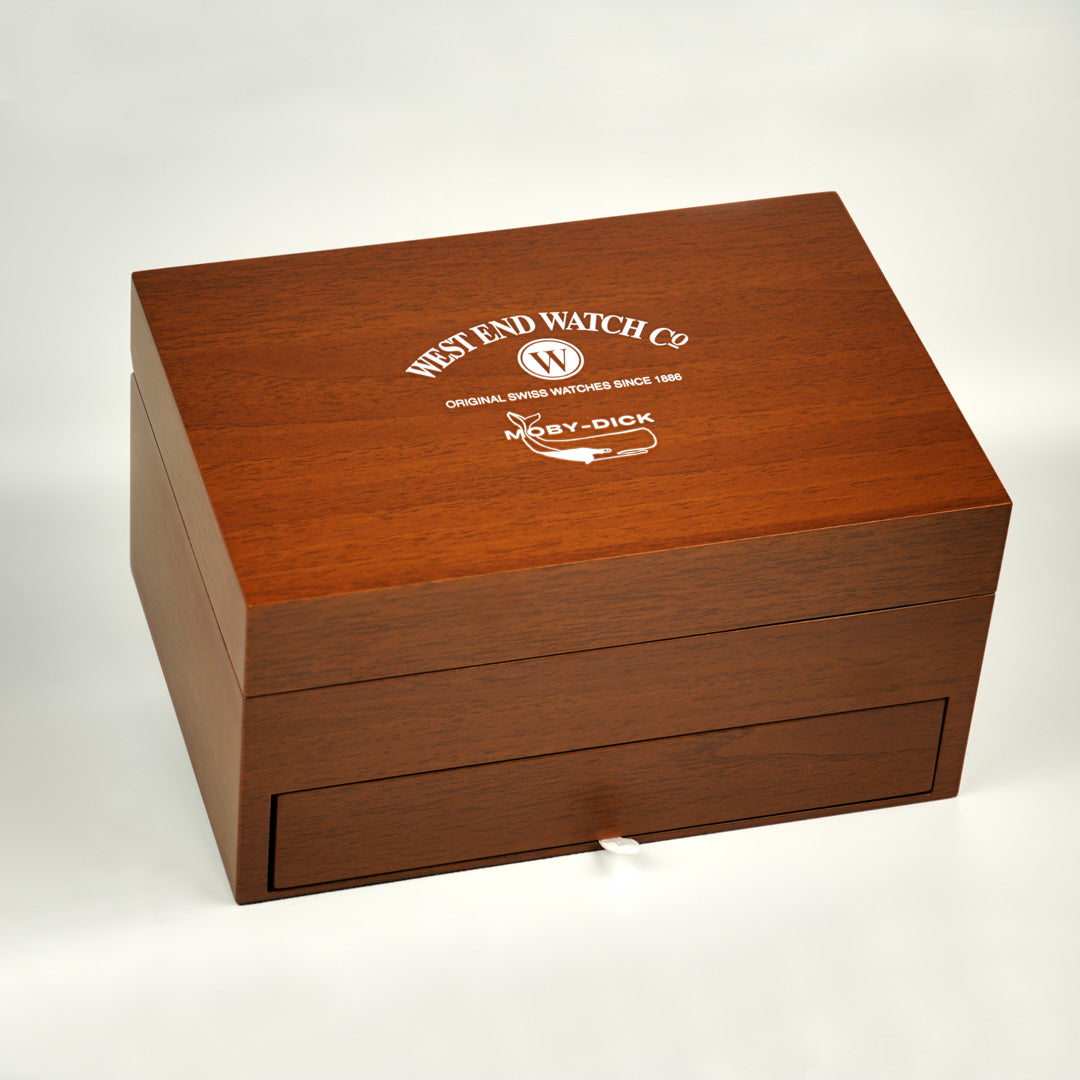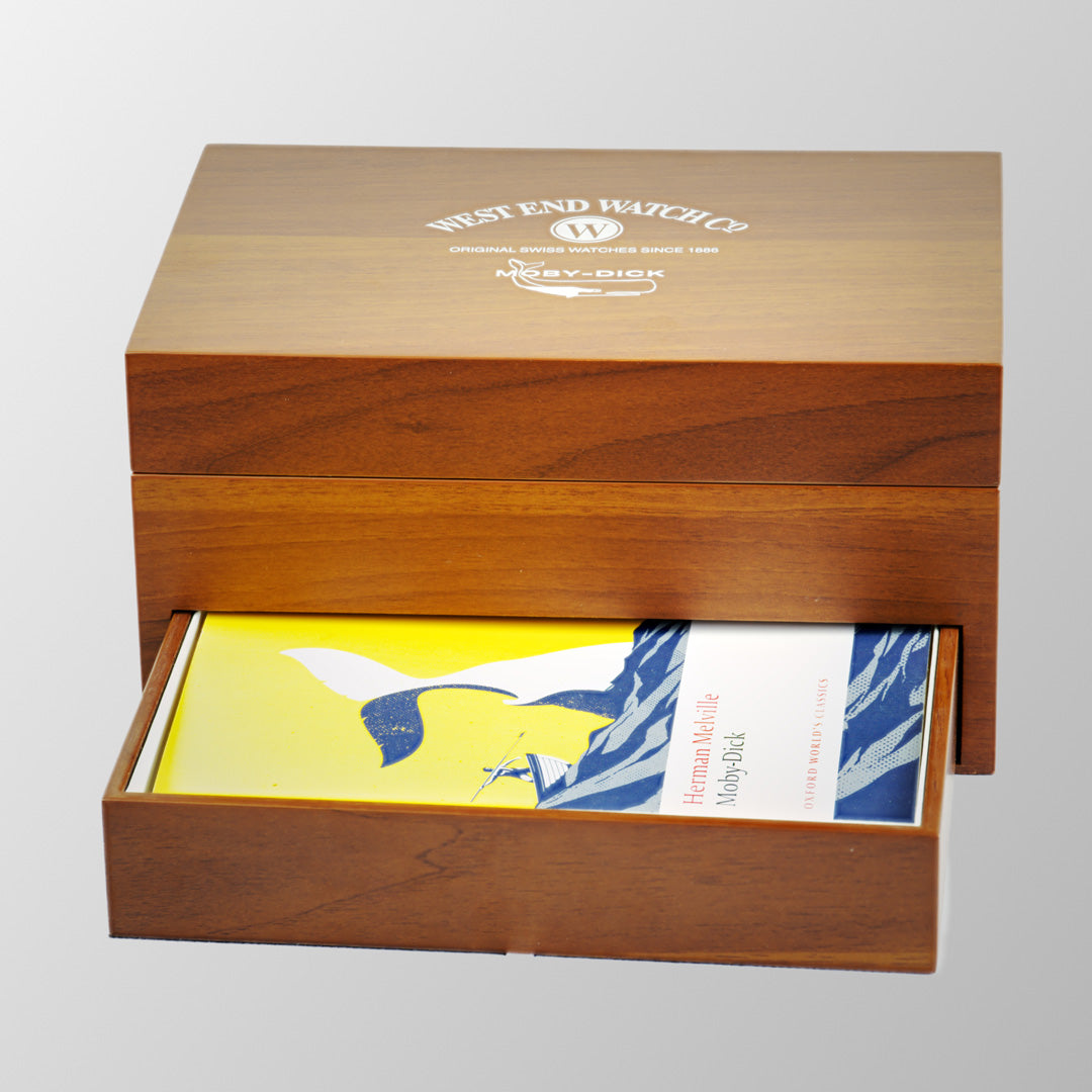 - Big wooden box with a drawer containing the novel Moby-Dick by Hermann Melville