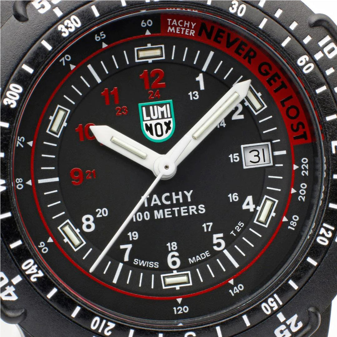 The Never Get Lost watch is a durable timepiece housed in a 45mm CARBONOX™ case. It features a black dial with contrasting red numbers, a unidirectional ratcheting bezel and a CARBONOX™ caseback. Water resistant to 100 meters, it comes equipped with a black PU strap adorned with a stainless steel signature buckle. Its proven Luminox Light Technology lighting system guarantees self-powered readability in the night. "Always Visible" for 25 years.