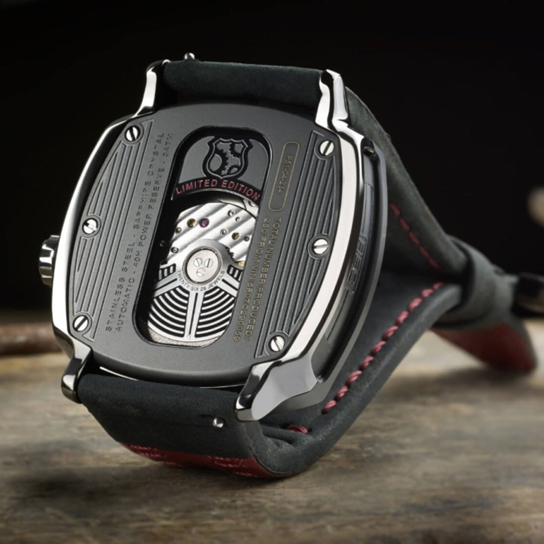 Only 250 timepieces are made and each of the REC P51-04 Raven Black is visually unique. Every dial has its unique patina, VIN number from the car and the serial number is engraved on the case back. The mandatory scan-able story card is in- cluded together with a one-time only sticker – all in the gift box tin can.
