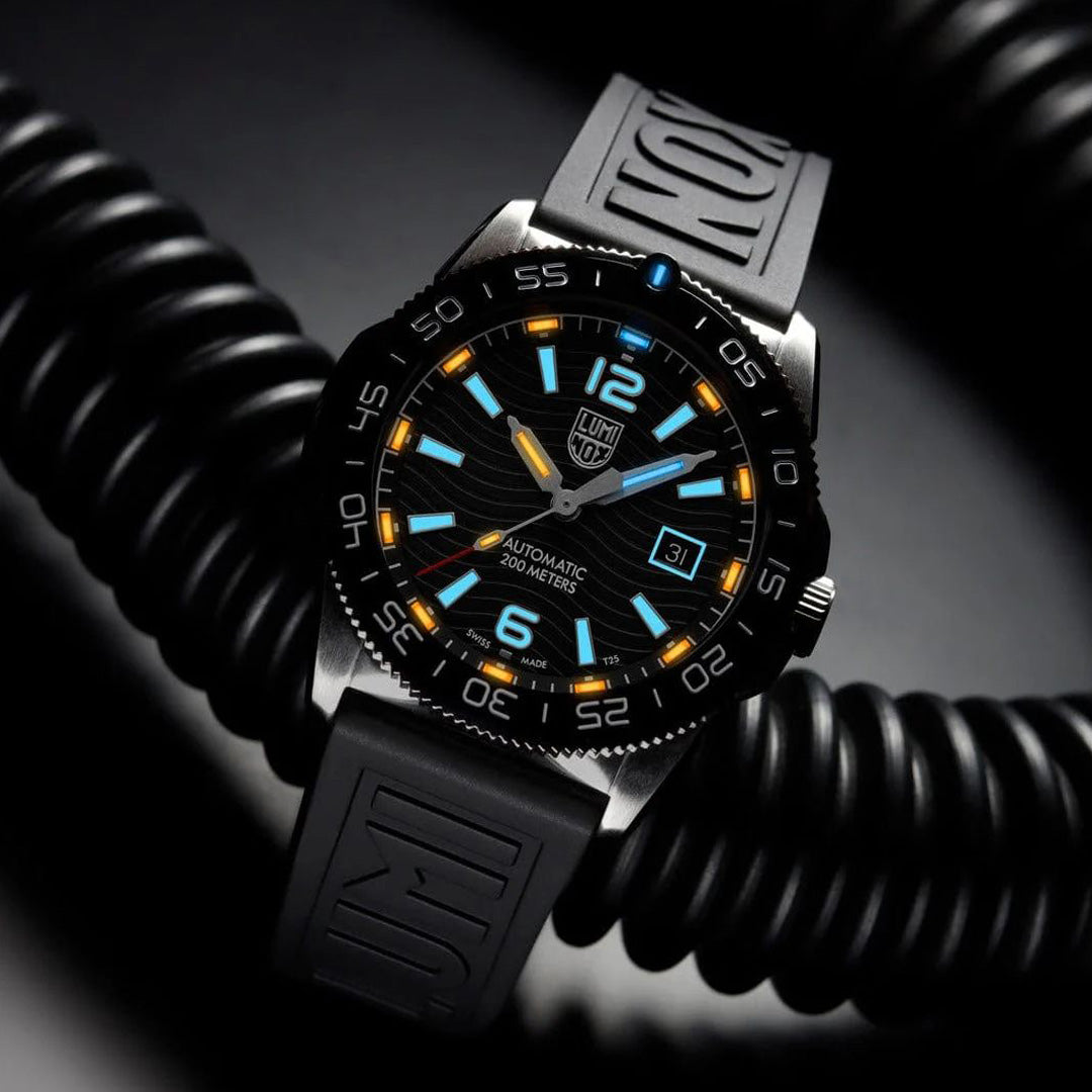 The Pacific Diver series stands out with a sporty look and intriguing fusion of materials. The XS.3101 watch features a black cut-to-fit rubber strap and versatile 42mm stainless-steel case with sapphire crystal and anti-reflective coating. A stainless-steel bezel with a ceramic ring insert completes the design. To evoke the spirit of the ocean, the Pacific Diver Automatic sports a distinct textured black dial with a wave pattern. The intricate SELLITA automatic movement provides a new level of precision powered by the wearer’s movements. Whether you’re in the office, catching a wave, or hundreds of meters underwater, this dynamic timepiece is engineered for peak performance.