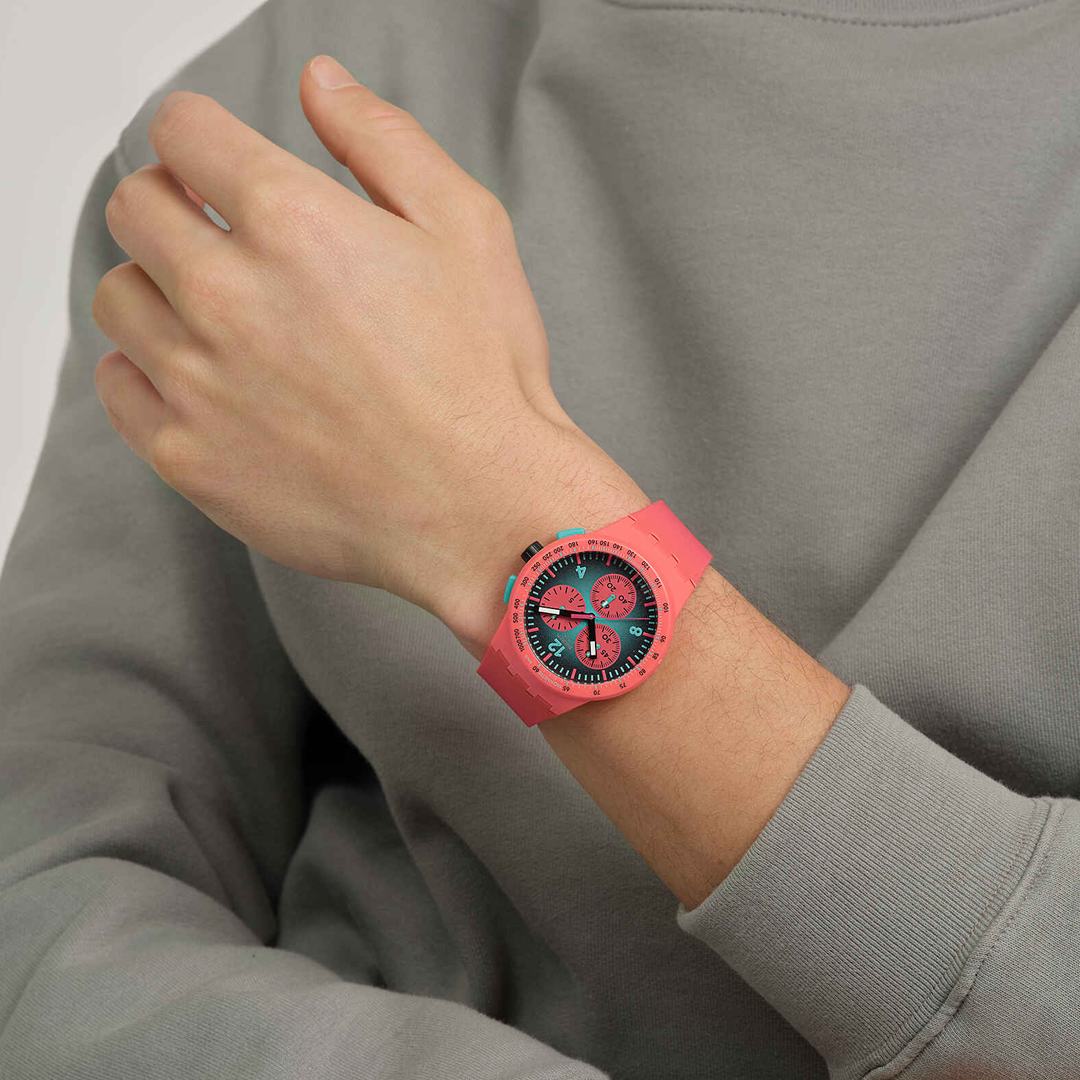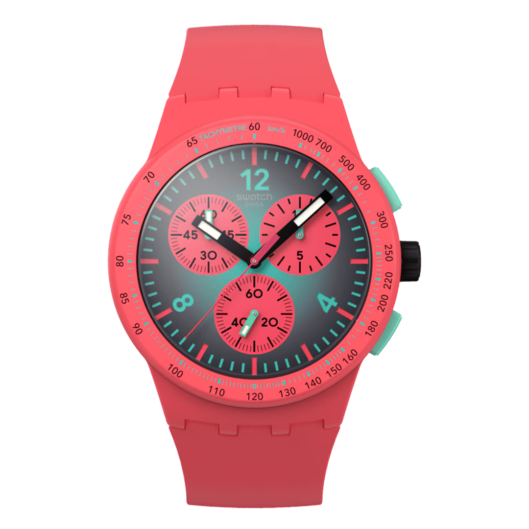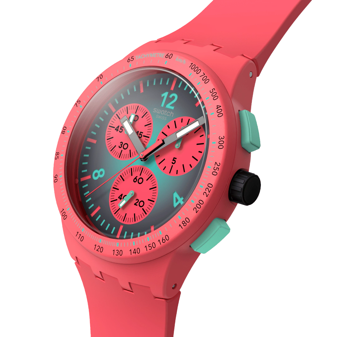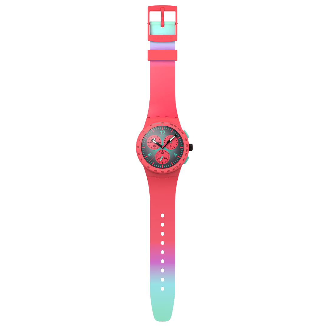 This chronograph features a gradient turquoise and dark green dial with multi-colored print, black hour and minute hands that glow in the dark and a dark pink seconds hand. The matte dark pink case has a matching bezel with black and turquoise printed tachymeter scale, matte turquoise pushers and a black crown. A matte, gradient dark pink and turquoise strap, matte dark pink loop and matte dark pink buckle complete the watch.