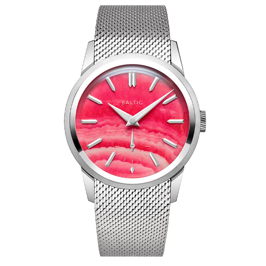 Dial: Pink Albite stone dial, Brushed dauphine hands with polished chamfers. Polished and applied indexes