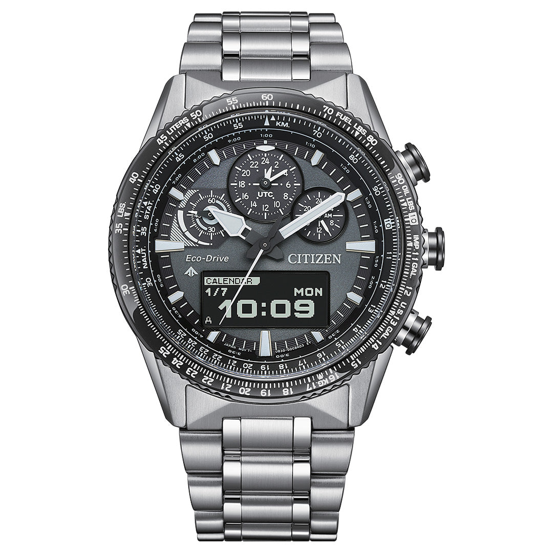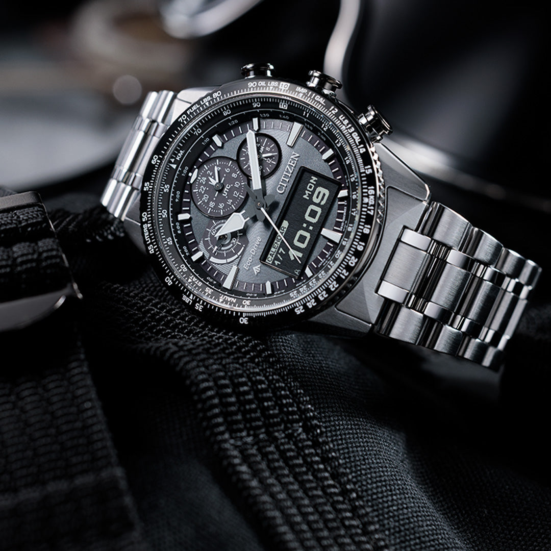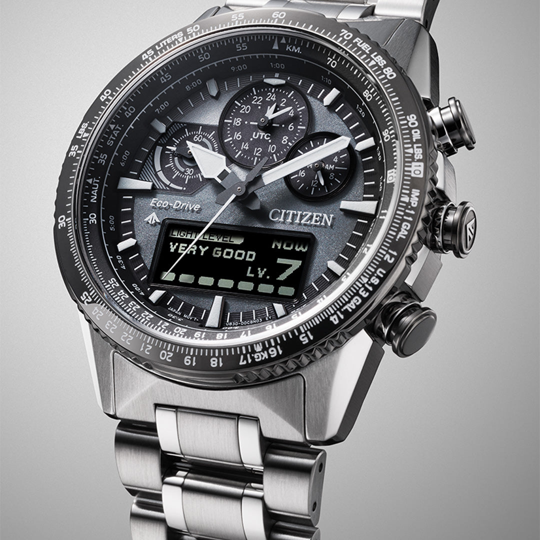 Functions: 24hrs, Date, Day & Month Display, MIP (Memory In Pixel) LCD display, Light Level Indicator (7 days record), Eco-Drive (recharged by any light source, no need for regular battery replacement), Overcharge Prevention Function, Insufficient Charge Warning Function, Alarm, Chronograph, Split & Lap Time Counter, Timer, Perpetual Calendar, Dual Time, 43 Areas World Time, Summer Time (ON/OFF), UTC (Universal Time Coordinated), Power Reserve Level Indicator, LED Lights