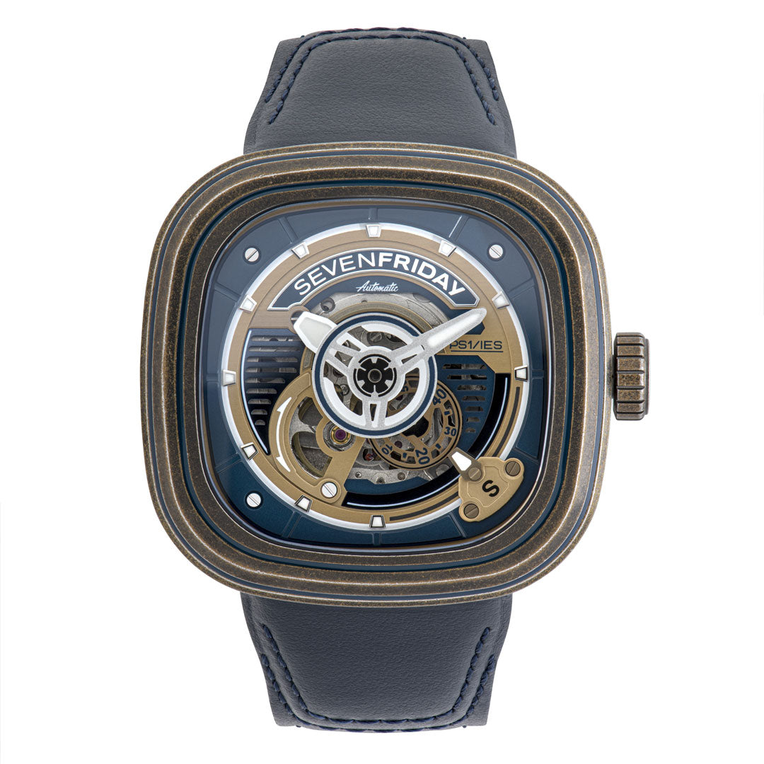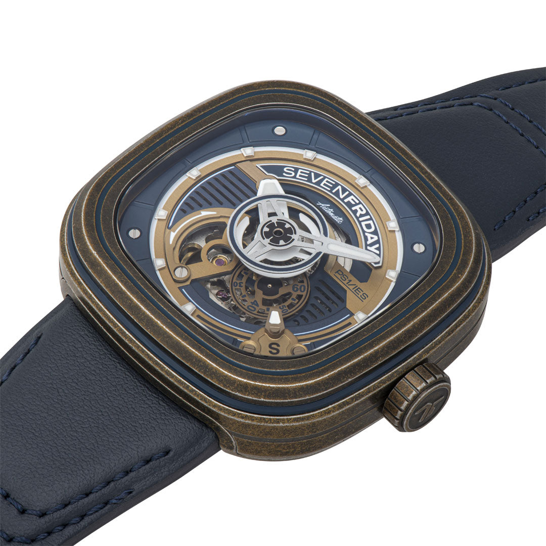 The PS1/04, unlike version I & II, is closer to Captain Nemo and the Nautilus than Captain Stubing and the Love Boat! The PS1/04 automatic Miyota movement is encased in an antique brass construction that immediately gives it an authentic instrument feel, more at home racing across the seas on the Clipper Cutty Sark than sipping cocaktails in the Med! Navy blue opaline highlights and luminous filled indexes brighten the dial distinguishing it from the more utilitarian nature of the case. The design is topped off with a navy blue leather strap with genuine tanned suede lining. Oh, and it’s sapphire crystal protected and waterproof to 3 ATM; so strap it on, pour sea water over you and be ready to repel boarders or fend off giant squids!
