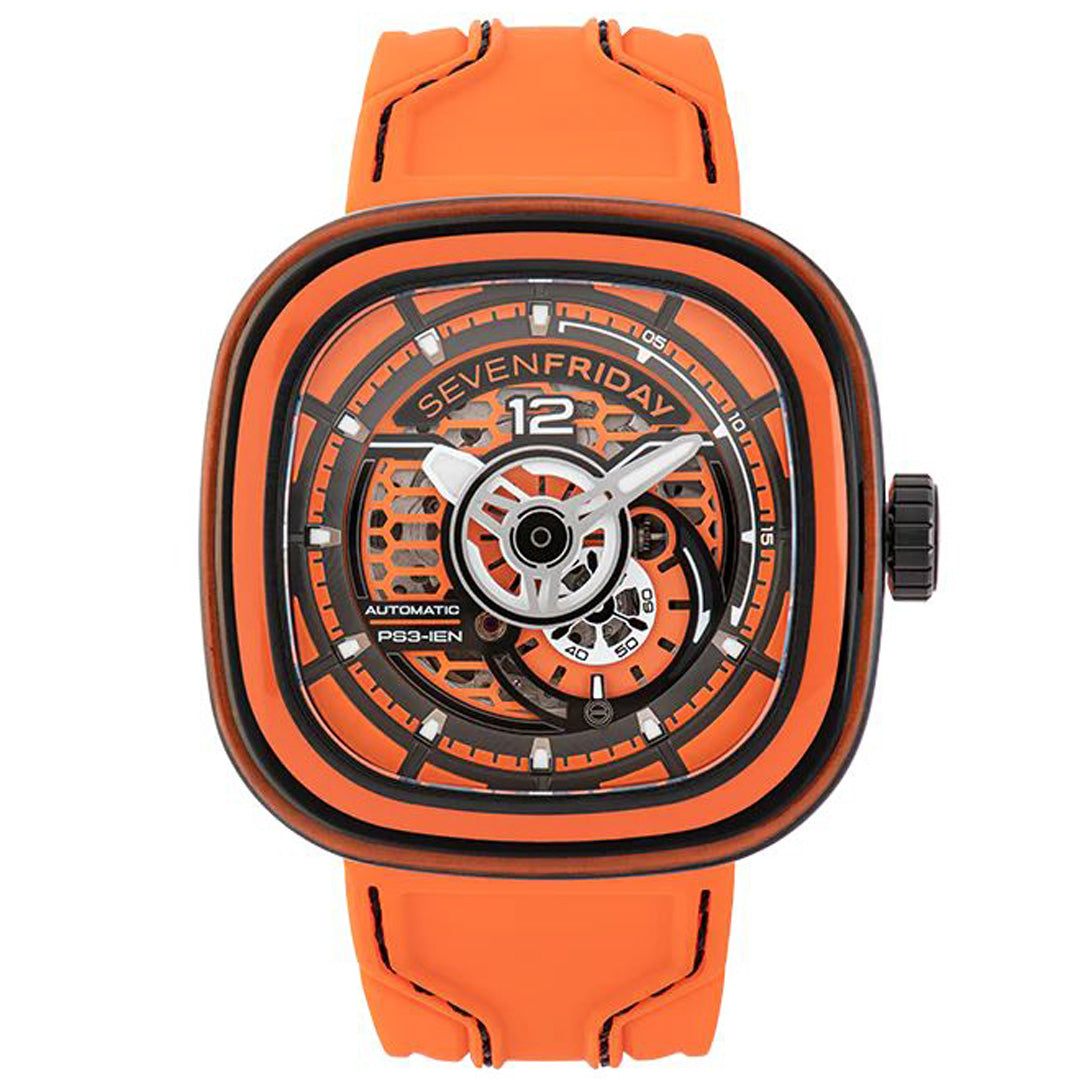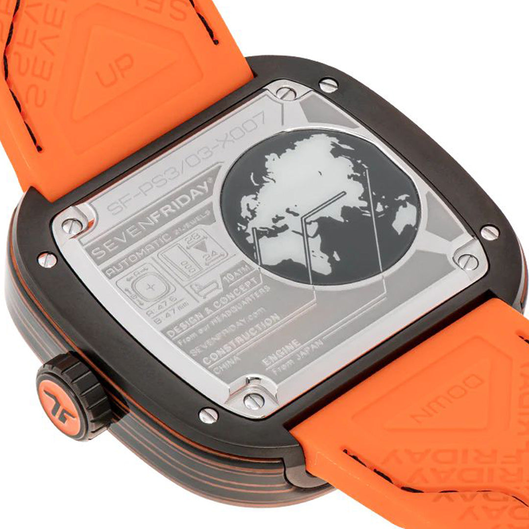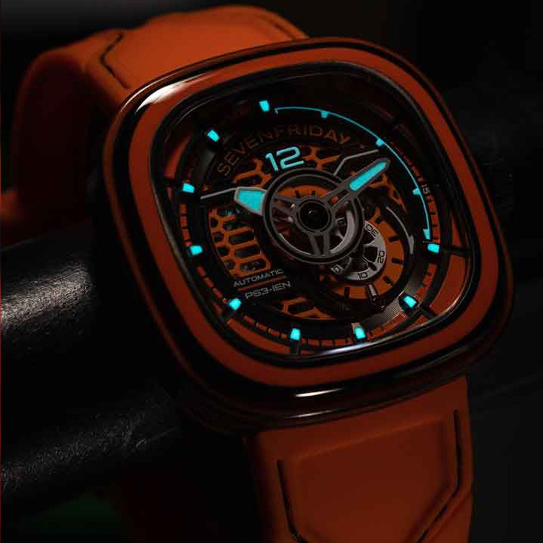 The new PS-Colored Carbon offers a vibrant choice of three striking colors: PS3/03 in orange, PS3/04 in blue, and PS3/05 in green! Nestled in the more technical PS range, the watches’ animation ring is made of a special combination of carbon fibre and coloured resin, the latter matching the dial, strap colour and the Berlac filled bezel.