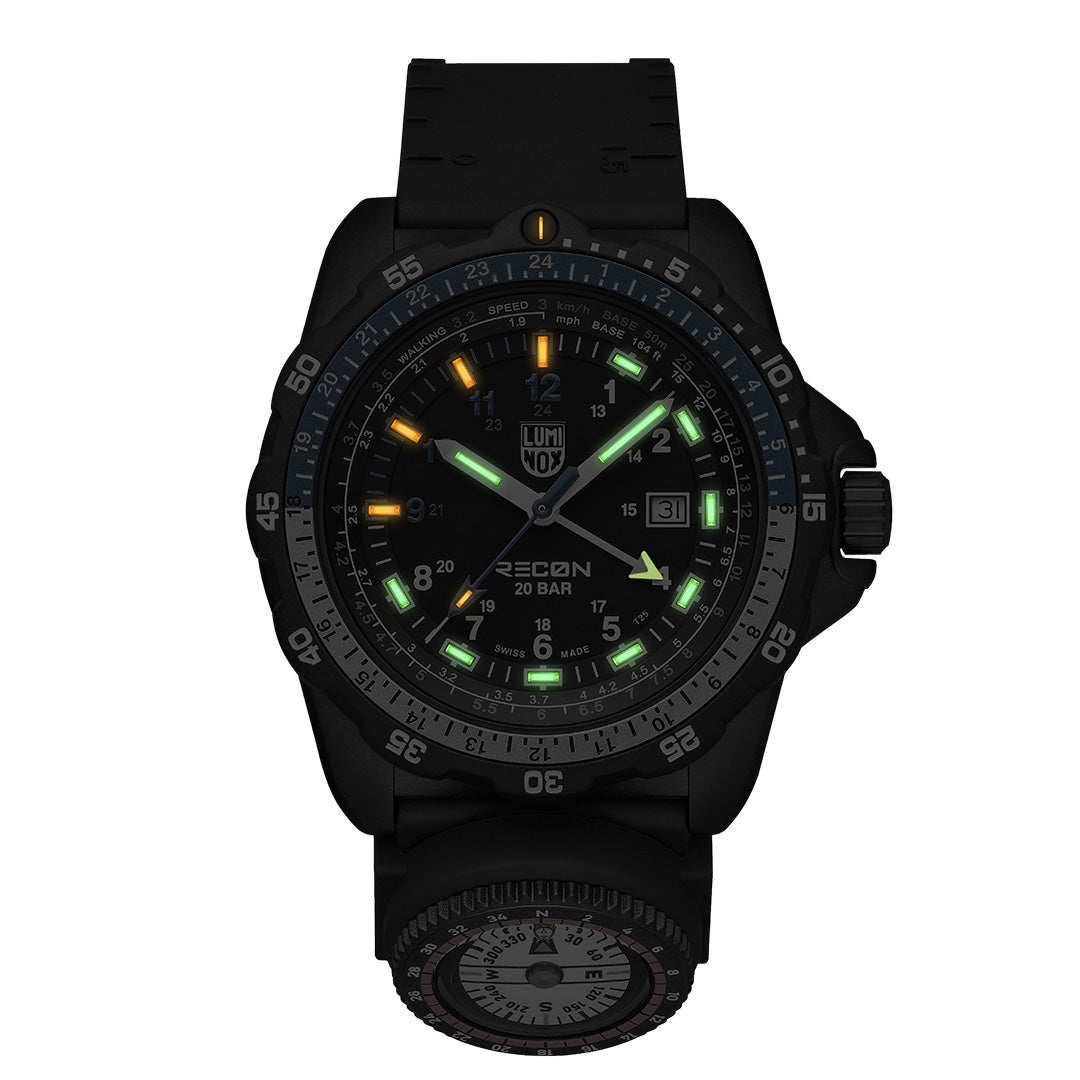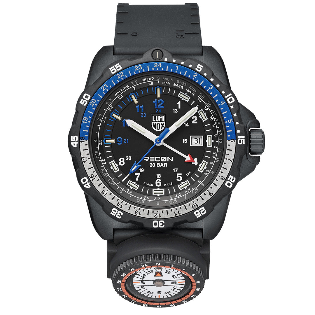Built in collaboration with tactical specialist Andrea Micheli, this rugged 46 mm timepiece is engineered for precision navigation. The XL.8833 is constructed from a lightweight yet ultra-durable CARBONOX™ case and a unidirectional rotating bezel with a two-tone aluminium ring insert. The striking blue top of the ring insert, the indexes 9-12 and the second hand create an interesting colour highlight. The dial is protected by a sapphire crystal with anti-reflective coating, and the watch is water resistant up to 200 metres. Powered by a Swiss quartz GMT movement, the XL.8833 lets you track two time zones simultaneously perfect for global missions or international travel. The black rubber strap includes integrated map scales and ruler markings, plus a detachable compass, transforming the watch into a complete navigation instrument. Thanks to Luminox Light Technology, the XL.8833 remains visible in all light conditions with a constant glow lasting up to 25 years.