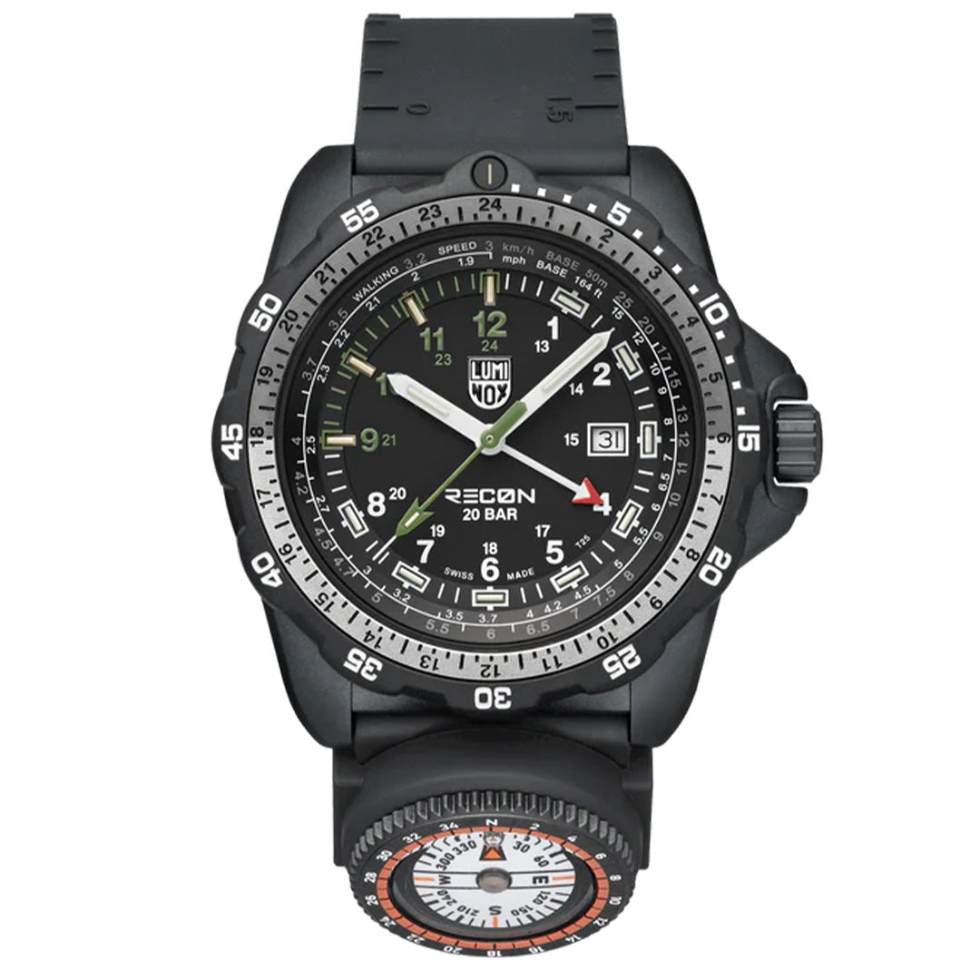 Built in collaboration with tactical specialist Andrea Micheli, this rugged 46 mm timepiece is engineered for precision navigation. The XL.8837.SET is constructed from a lightweight yet ultra-durable CARBONOX™ case and a unidirectional rotating bezel with a two-tone aluminium ring insert. The indexes 9-12 and the second hand in grasshopper green create an interesting colour highlight. The dial is protected by a sapphire crystal with anti-reflective coating, and the watch is water resistant up to 200 metres. Powered by a Swiss quartz GMT movement, the XL.8833 lets you track two time zones simultaneously perfect for global missions or international travel. The black nitrile rubber strap includes integrated map scales and ruler markings, plus a detachable compass, transforming the watch into a complete navigation instrument. This set comes with an additional grasshopper green webbing strap for added versatility. Thanks to Luminox Light Technology, the XL.8837.SET remains visible in all light conditions with a constant glow lasting up to 25 years.