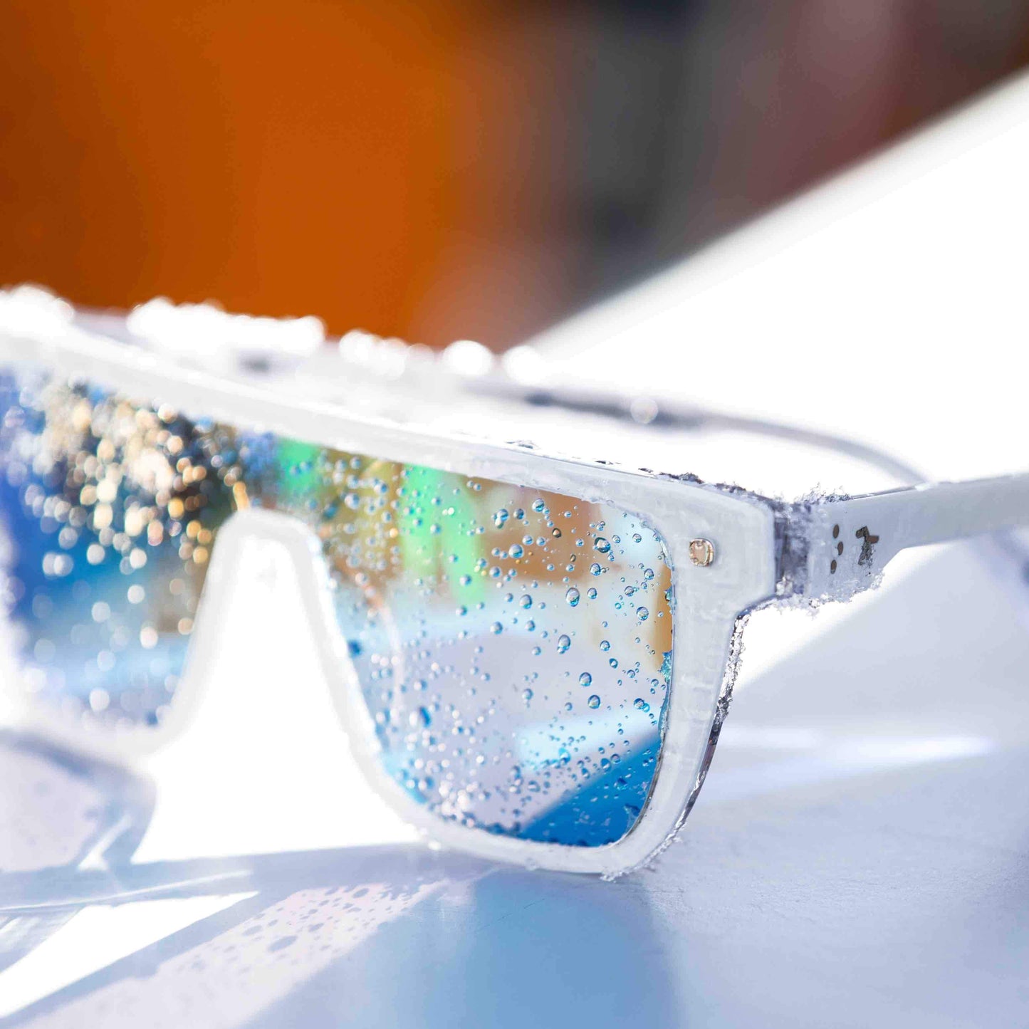 Less chilled and more high-energy, the SAF1B/01 a.k.a "YETI" features both a white and clear layered acetate with electric azur blue mirrored lens with anti-reflective coating on the inside.