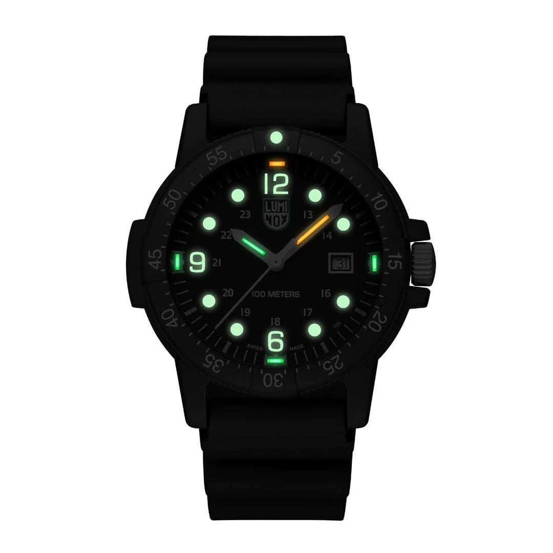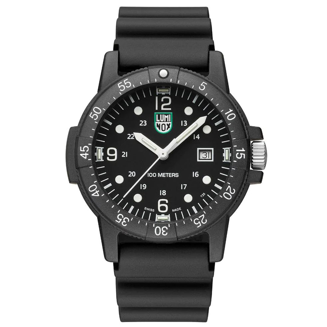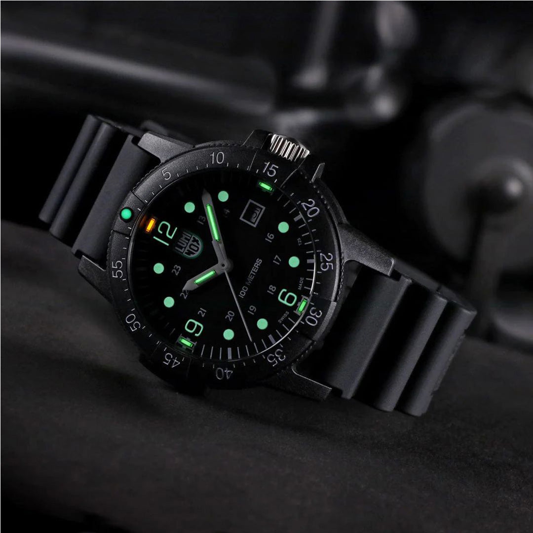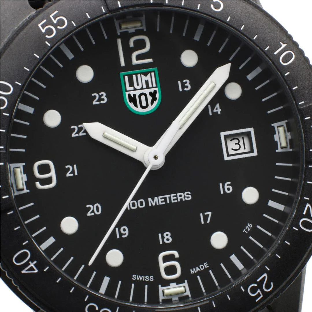 The Sea Bass features an impressive 44mm CARBONOX™ case and water resistance up to 100 meters. Its black dial with white numbers provides maximum readability during the day. At night, the proven Luminox Light Technology lighting system assumes this function. "Always Visible", self-powered, for up to 25 years.