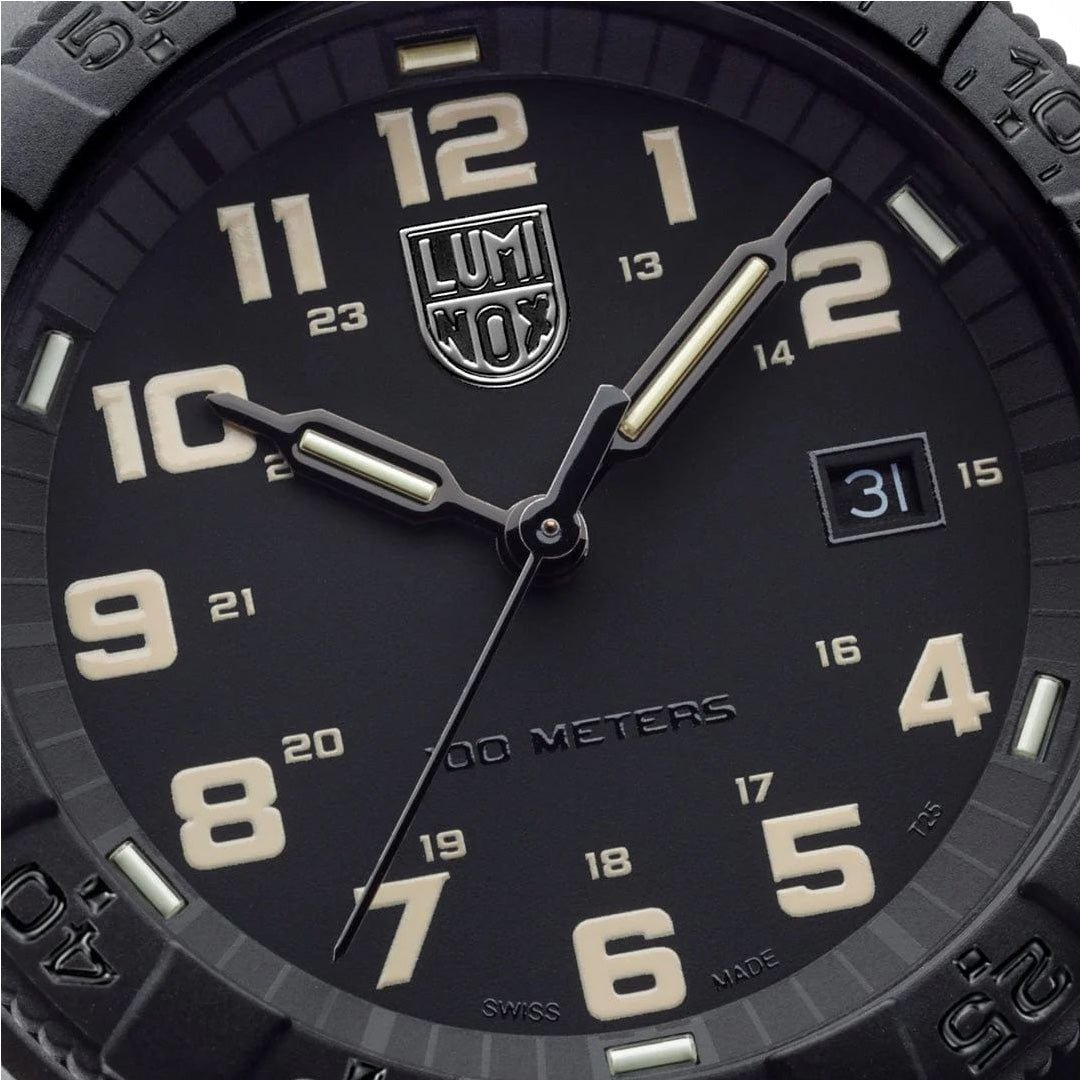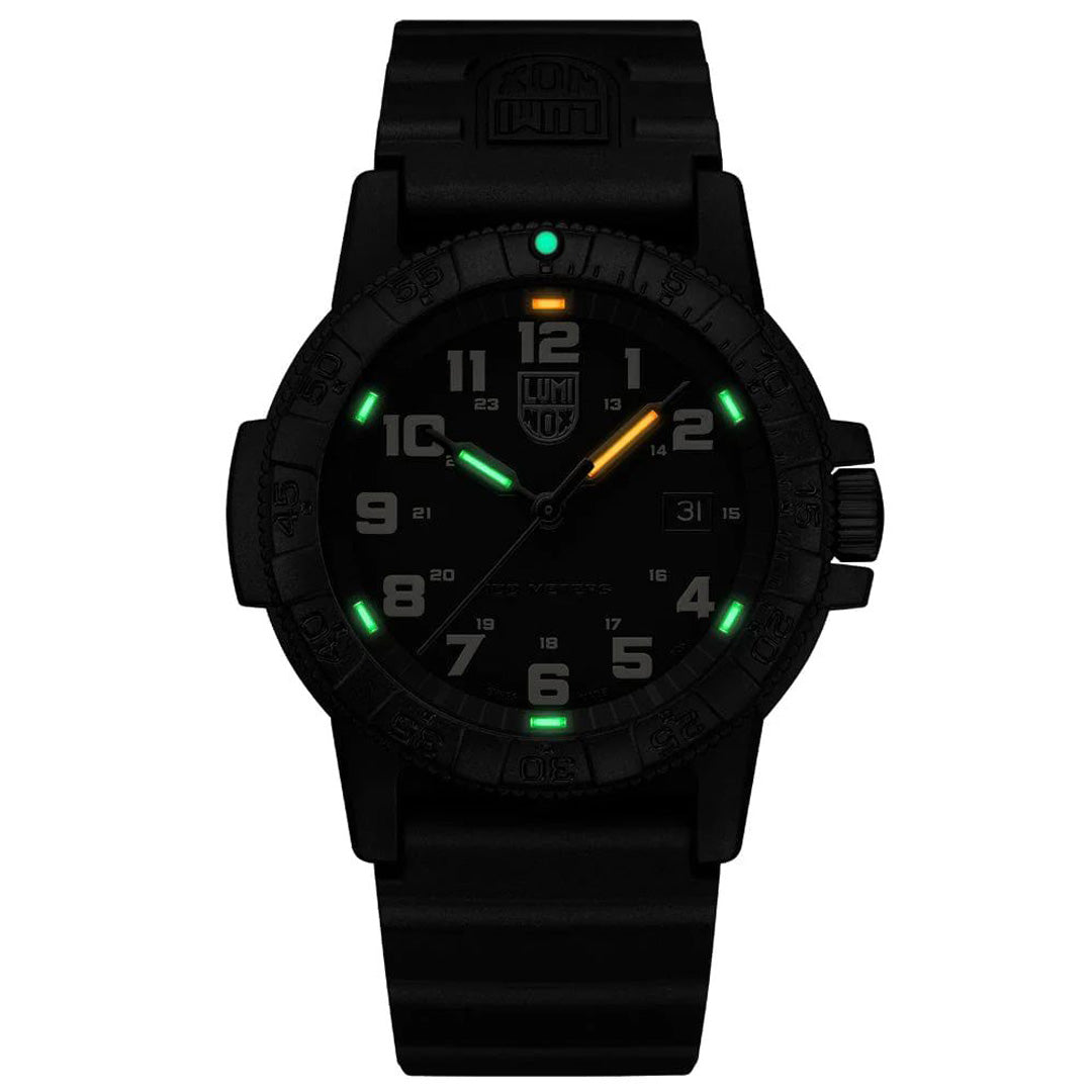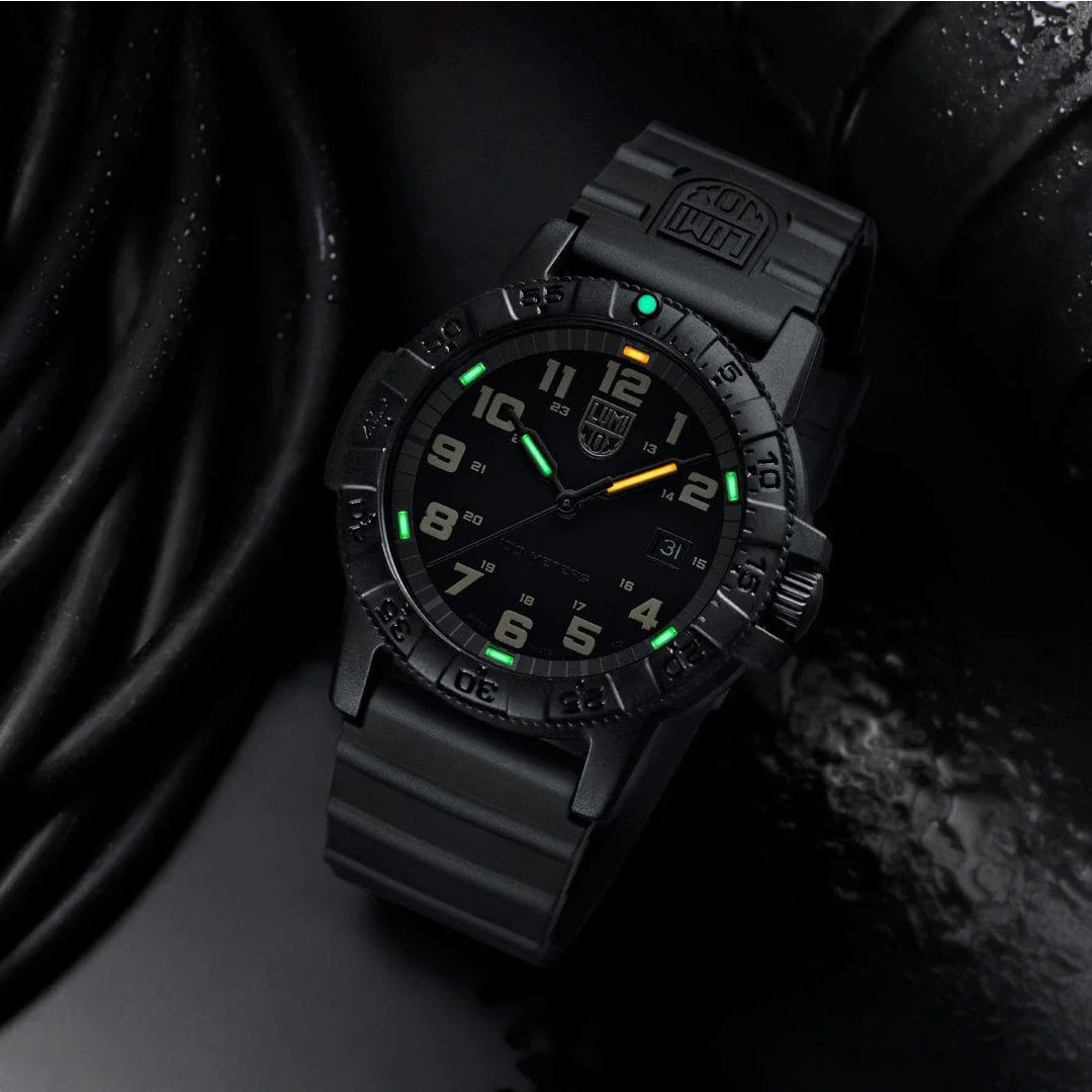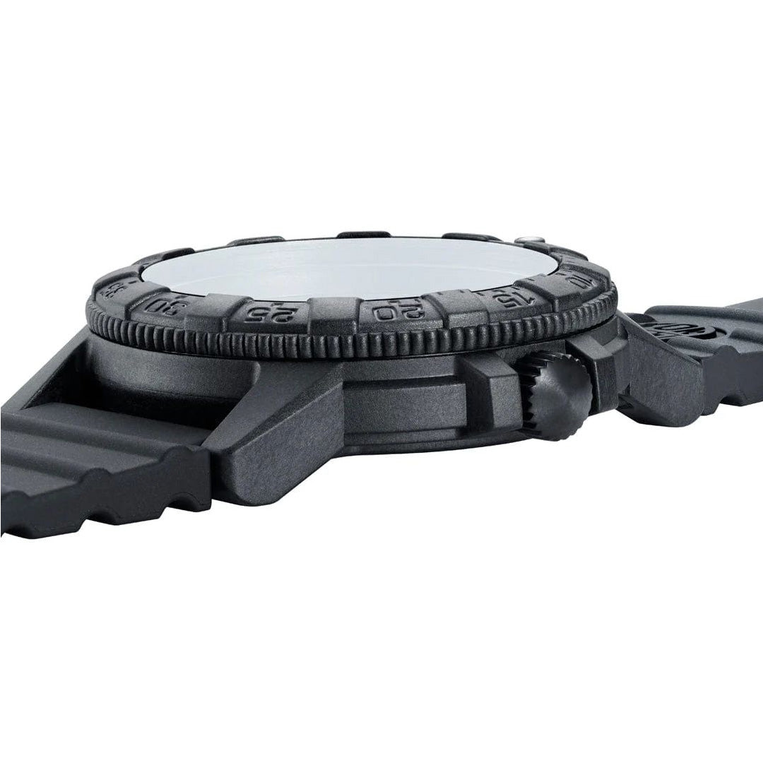 This watch is inspired by one of the ocean’s toughest sea creatures that travels thousands of miles across the Atlantic and Pacific Ocean, the Leatherback Sea Turtle. Just like its namesake this timepiece is tough and durable featuring a 44mm CARBONOX™ case and uni-directional bezel. The sand tone numerals and markers contrast the black dial, watch case and bezel. The classic case design with the protected crown balanced by an opposite outcropping has created the iconic “turtle shape”. The watch is powered by a Swiss Quartz movement and equipped with a SuperLumi-Nova bezel light at 12 o'clock, eight LLTs, and a black waterproof rubber strap ensuring readability and comfort in low light conditions on land or in water up to 100 meters.