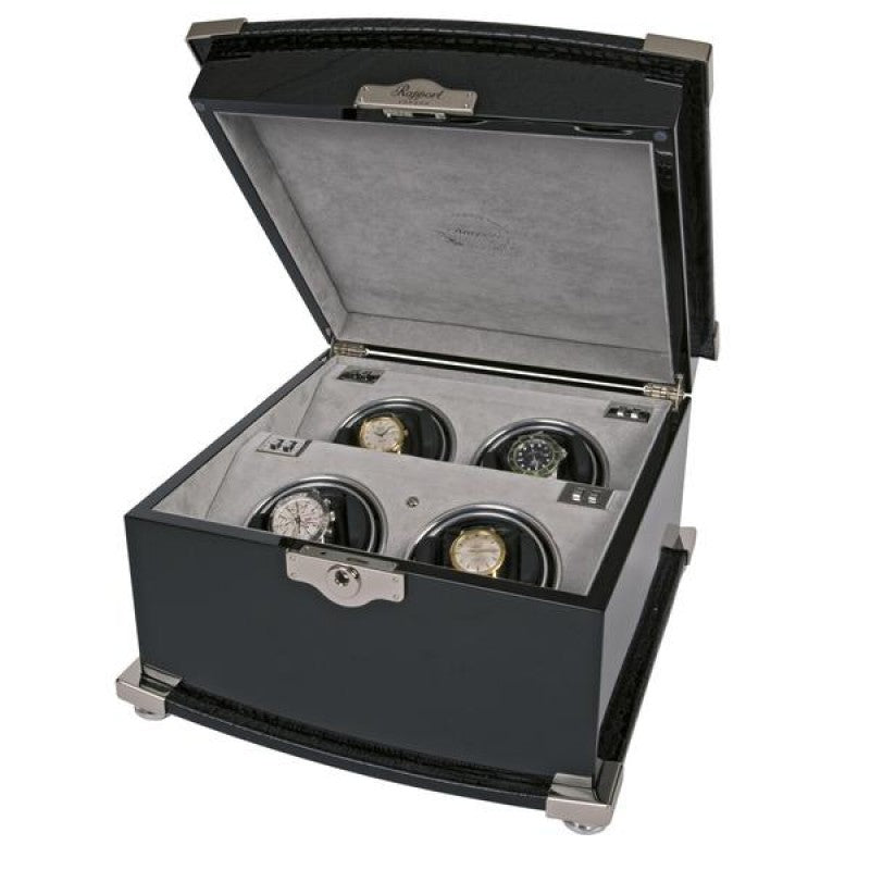 The Serpentine quad watch winder is a sophisticated chest that displays delicate curves in a high gloss piano finish. It features genuine leather with a crocodile skin effect embossing and chrome plated corners contribute to a luxurious feel. The interior is lined with a soft grey velveteen and four leather watch cushions, adjustable to fit your individual watches.