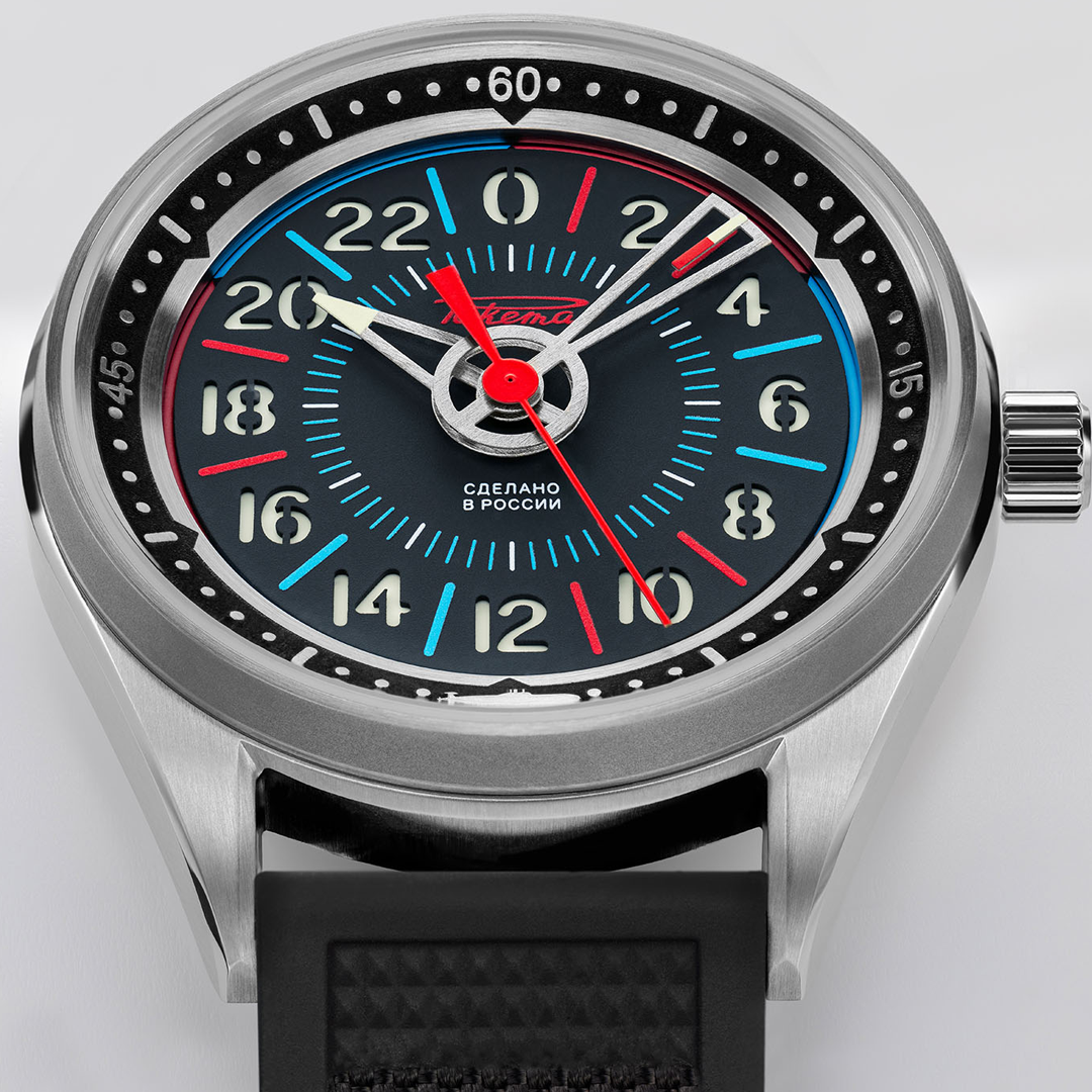 - These hands are powered by a Raketa 24 hour automatic movement (Raketa 2624А calibre) that allows submariners to distinguish day from night during their long underwater missions;