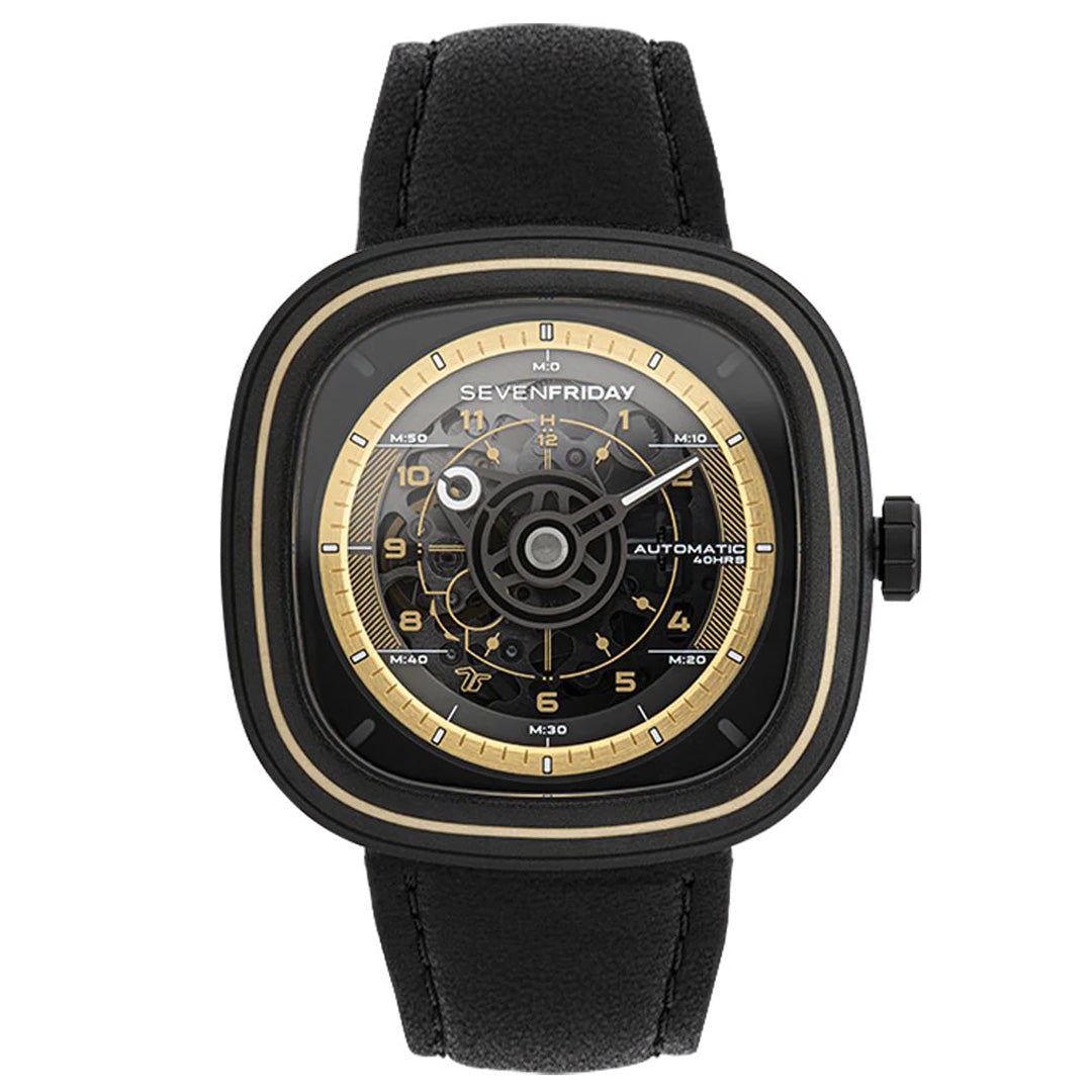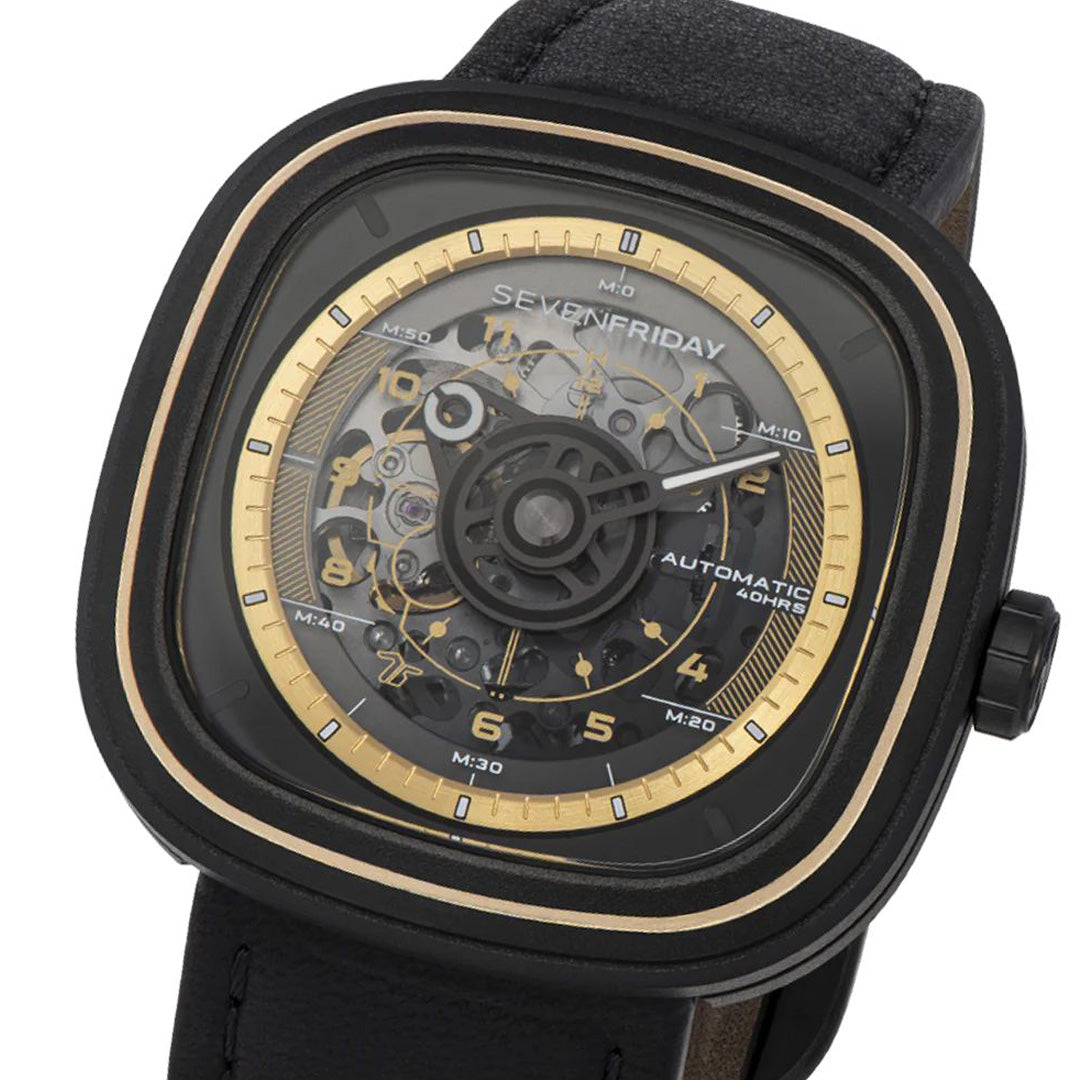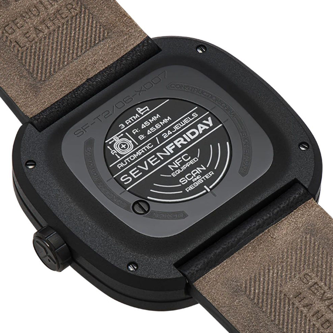 Industrial zeitgeist oozes further when you discover the gears and levers – intricate workings of its automatic skeleton movement with 40h power reserve - carefully assembled underneath the semi-transparent dial made of grey sun lens material.