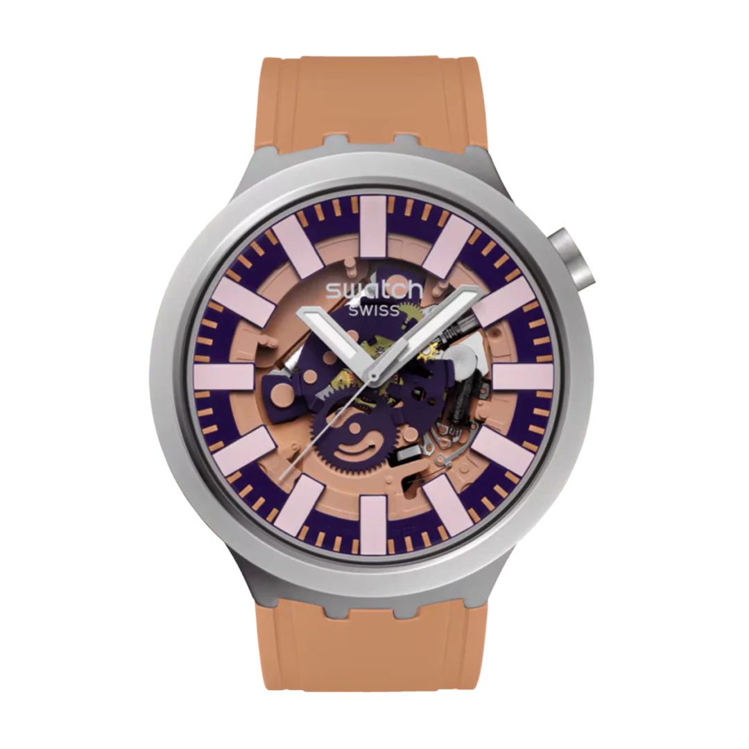 This oversize watch stands out with its dark purple open dial featuring dark purple movement elements, light pink hour markers, beige minute track, silver-colored hour and minute hands with glow-in-the-dark effect and a silver-colored seconds hand. The sandblasted stainless steel case with matching bezel and pusher is complemented by a matte beige strap with matte beige and light pink loops and a sandblasted stainless steel half-buckle.