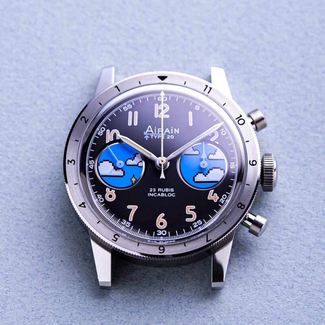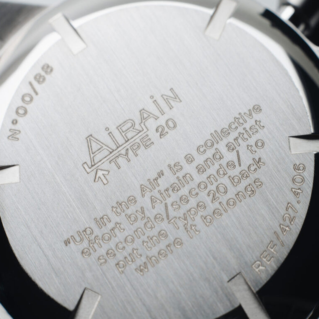 The ‘Up in the Air’ edition takes the Type 20 back to its roots, celebrating its historical association with the skies. With their rhodium-polished edges, the subdials create the illusion of aeroplane portholes, looking out on pixelated 8-bit clouds. The left subdial offers a subtle glimpse of the Eiffel Tower's tip. On the caseback, seconde/seconde/ explains his intentions: return the Type 20 to its rightful place – both in the sky and in France. The subtle inclusion of the Eiffel Tower is a reminder of the watch's heritage and its connection to French aviation.